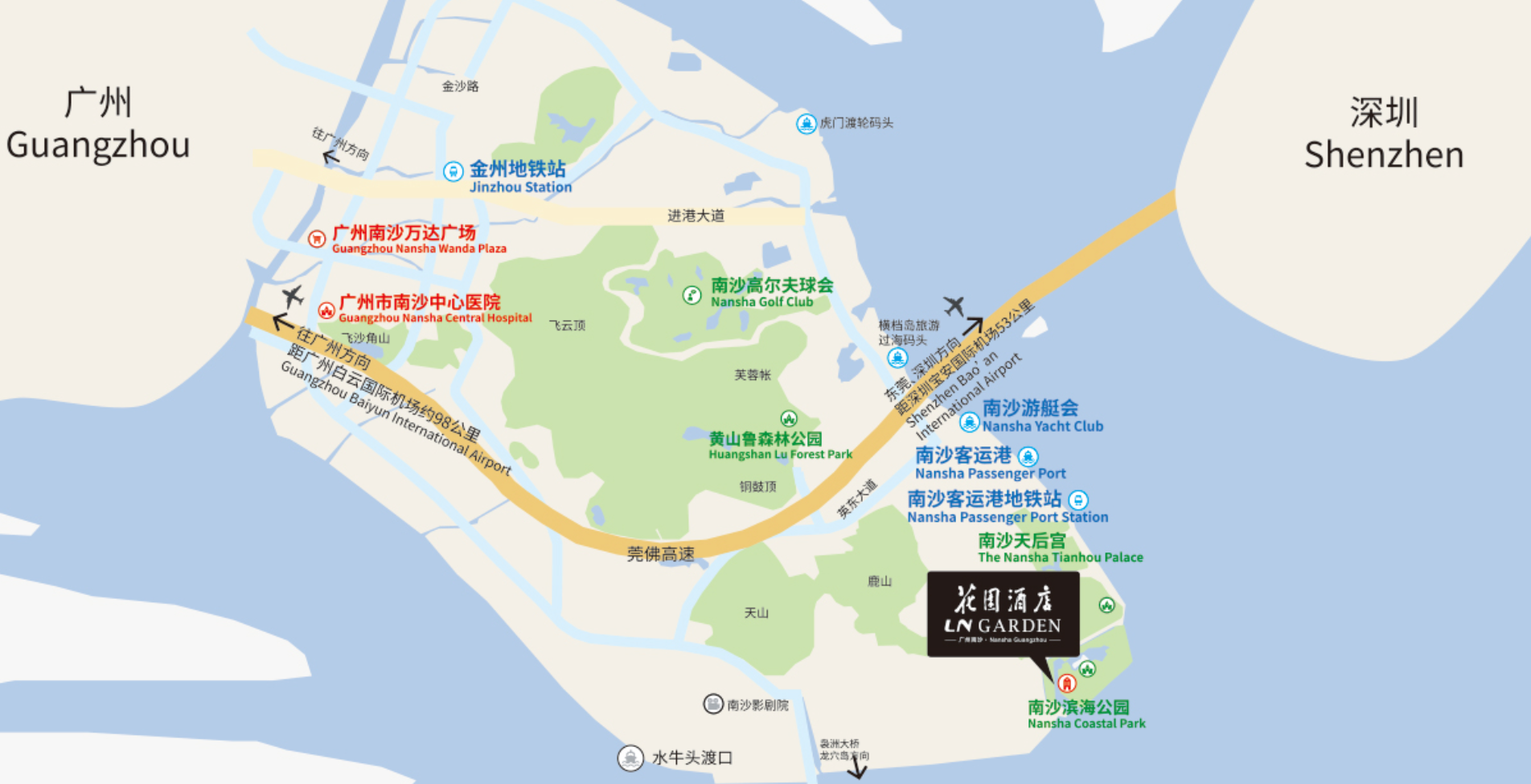 Located in the Binhai Park of the Guangzhou Nansha District Free Trade Pilot Zone, it is only 60 kilometers away from Guangzhou city, only 60 minutes' drive from Shenzhen Airport, and only 75 minutes by boat from Hong Kong's China Hong Kong City